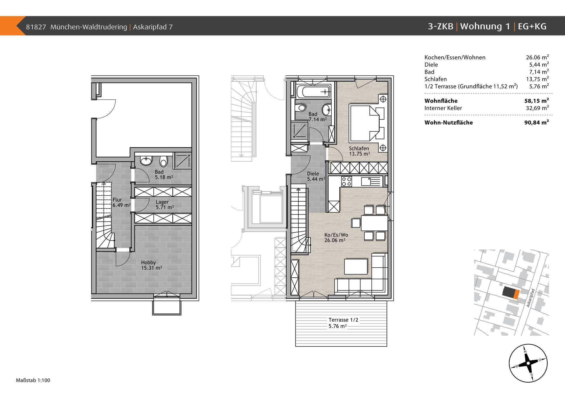 Erstbezug! Moderne 3-Zimmerwohnung im Erdgeschoss mit intern verbundenem Souterrainbereich, einer Süd-Terrasse (ca. 11,52 m²) und toller Ausstattung in bester Lage von Waldtrudering/München. Das 3. Zimmer ist der Hobbyraum im Untergeschoss. Hinweis! Die angegebene Wohnfläche entspricht nicht der Wohnfläche nach WoFlV (Wohnflächenverordnung), sondern es wurde die Wohn- und Nutzfläche inklusive internem, ausgebautem und beheiztem Keller berechnet. Bei der Kalkulation des Mietpreises wurde die Fläche des Souterrainbereichs jedoch günstiger angesetzt als die Wohnfläche. Auf Wunsch kann ein Außenstellplatz für 50,00 € dazu gemietet werden. Zusätzlich kann bei Bedarf eine Wallbox dazu gemietet werden. Die Wohnung ist ab dem 01.03.2026 bezugsfertig.