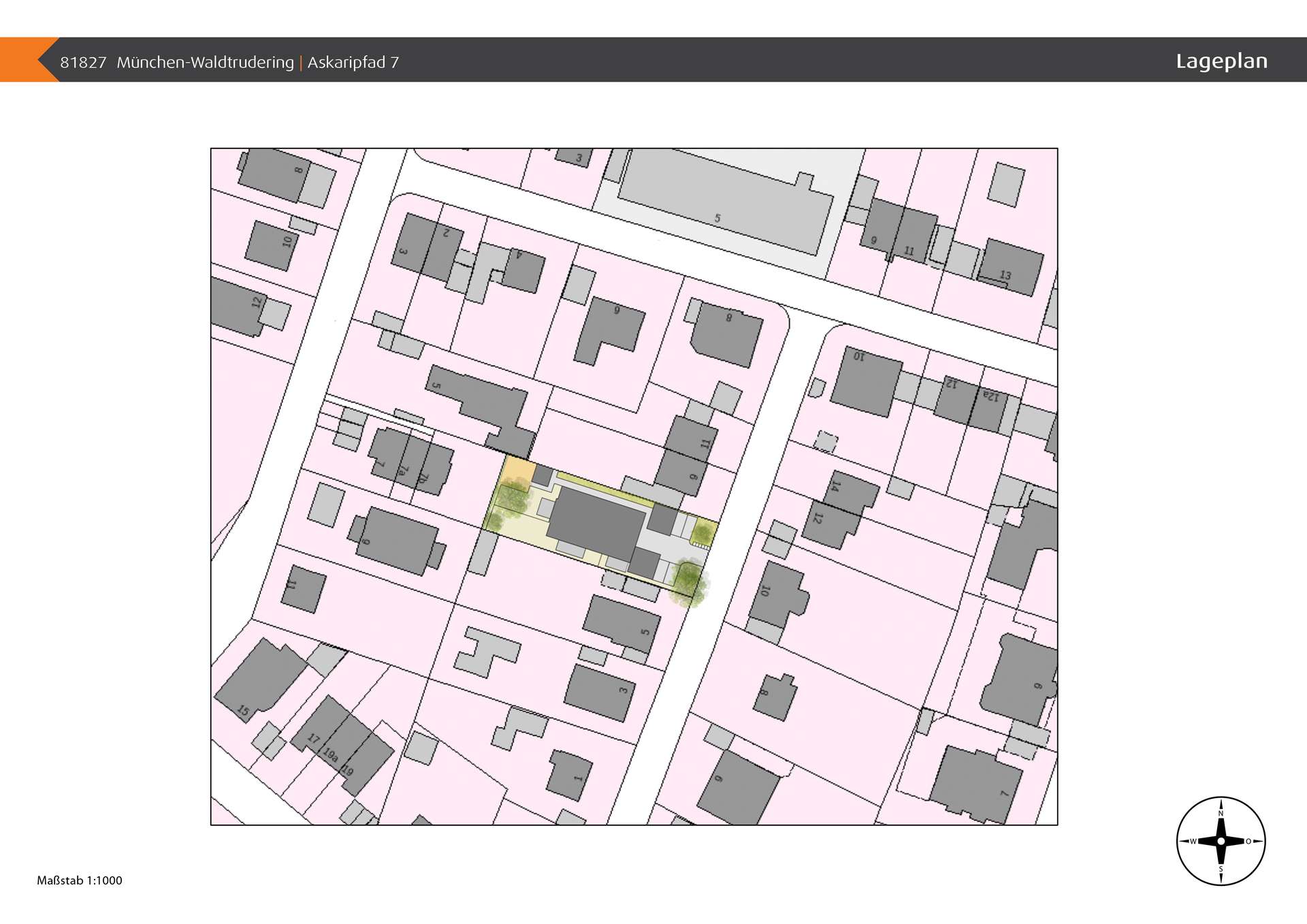 Ruhige und naturnahe Lage im Askaripfad 7 in München-Waldtrudering! Sämtliche Geschäfte des täglichen Bedarfs (Bäcker, Metzger, Supermarkt, Apotheke, etc.), befinden sich in unmittelbarer Nähe und sind in Kürze erreichbar. Die nächste S-Bahnhaltestelle (Gronsdorf), befindet sich ca. 1,3 km vom Objekt entfernt und ist fußläufig in ca. 15 Minuten zu erreichen. Die Entfernung zum Waldtruderinger Forst beträgt ca. 900 Meter.